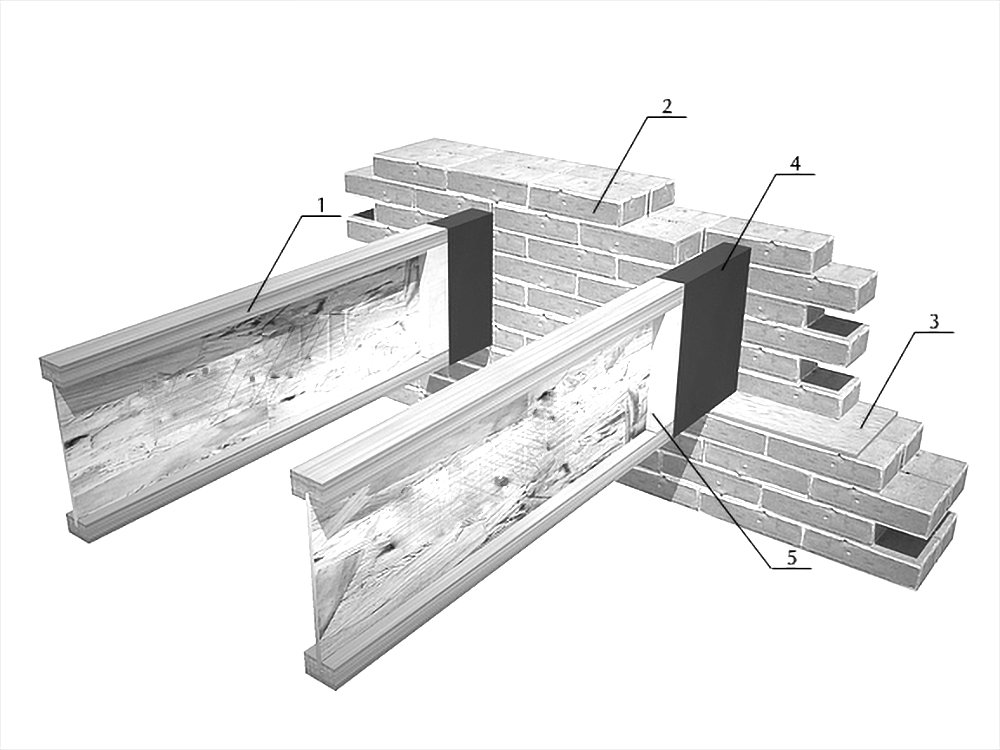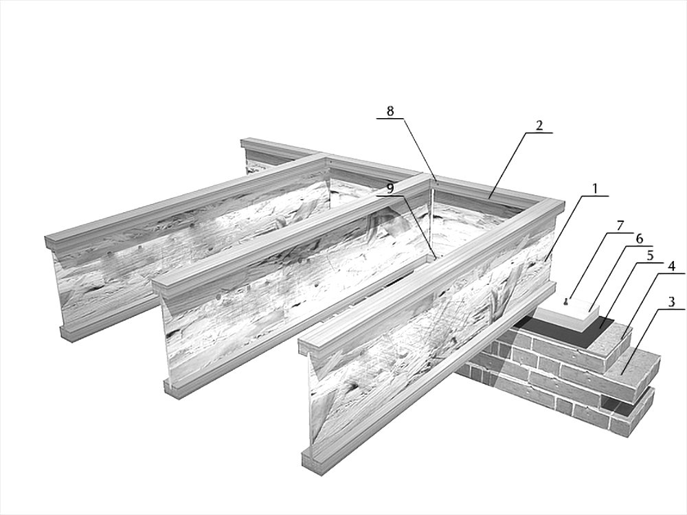 The most optimal solution for supporting floor joists on an external load-bearing brick wall. Inserts made from OSB, plywood, or board can be used to strengthen the I-beam at the support point. The insert should have a 5 mm gap from the top flange of the I-beam, with a minimum width of 30 cm. The beam should rest 15 cm on the wall. All wooden structures must be protected from contact with cement using waterproofing.