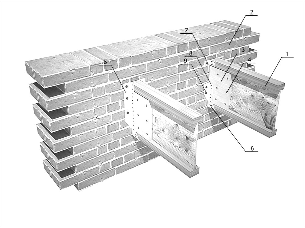 This node is used when no brick masonry is planned above the flooring, such as with a framed second story or where the roof truss system is directly supported on the I-beams. In this case, the masonry is completed with a reinforced screed, to which a tie beam (board or beam) is attached using anchors through waterproofing. The I-beams are then screwed into the tie beam. Refer to the section “Flooring in a Frame House.”